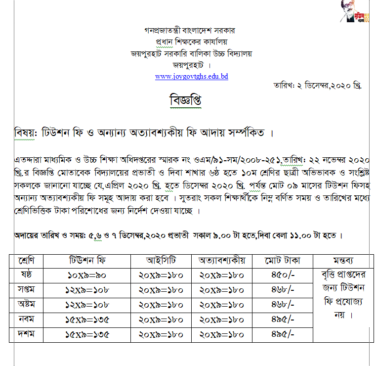 ০১ ডিসেম্বর ২০২০ প্রভাতী শাখার ৬ষ্ঠ ও ৭ম শ্রেণির সকাল ৯-১১টা,৮ম ও ৯ম শ্রেণি সকাল ১১-১-৩০ বিষয় ভিত্তিক শিক্ষকের নিকট জমা দিতে বলা হলো ।